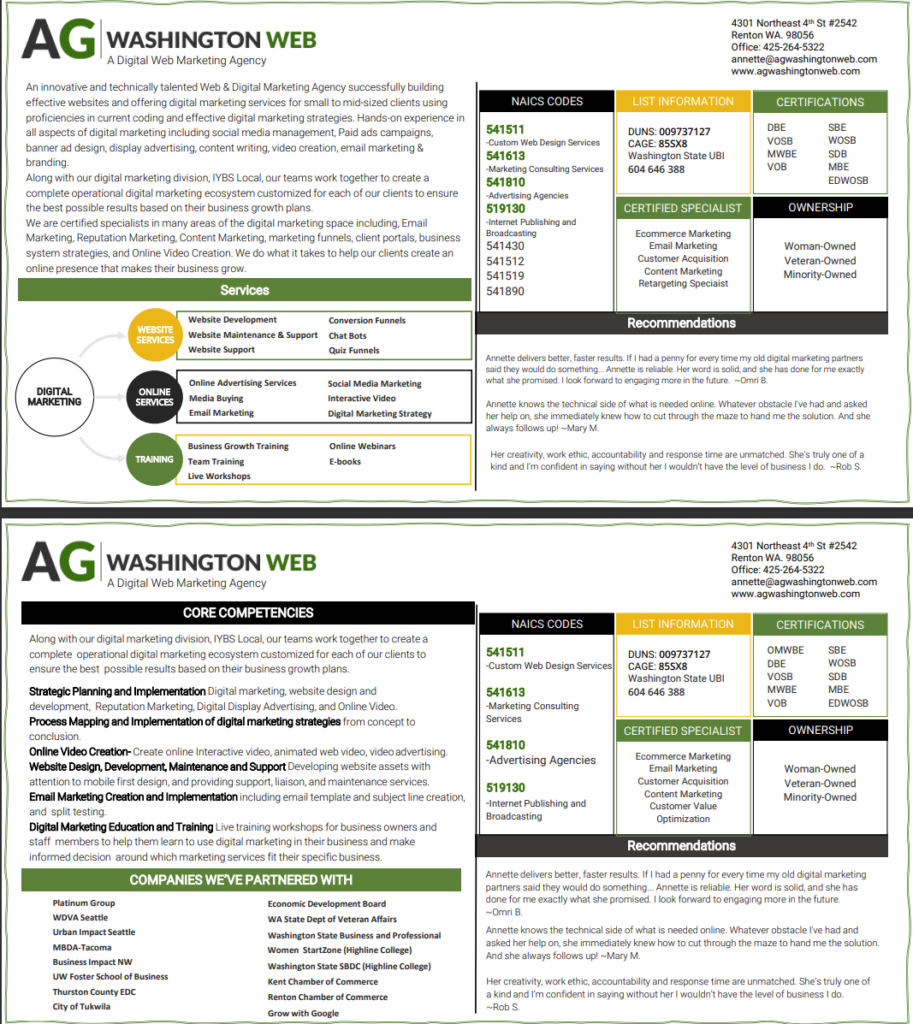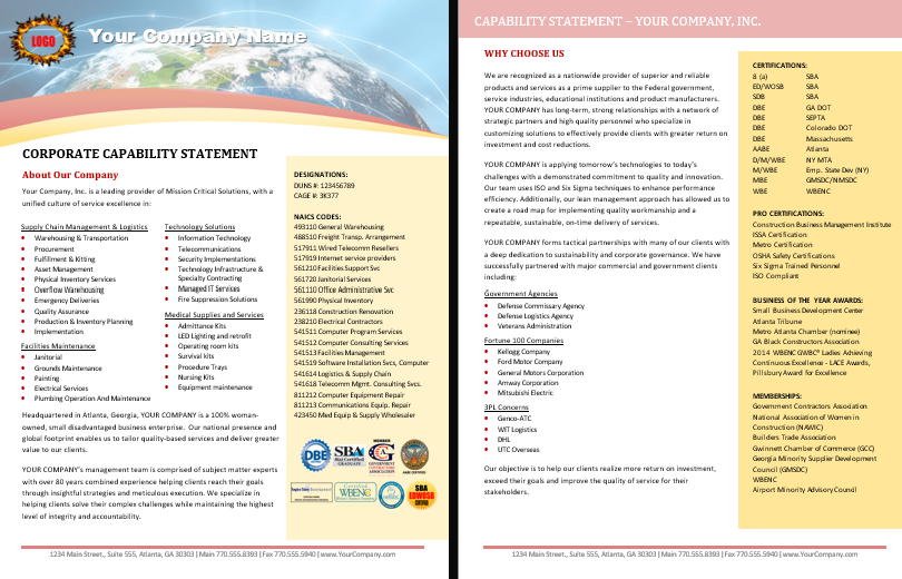 This is a customized Capability Statement created to show a combined capability of 2 or more teaming partners to support a project and past performance to increase your opportunity of winning the contract. This is usually a (2) page Capability Statement to accurately reflect both company’s core competencies. (2 to 3 Pages)